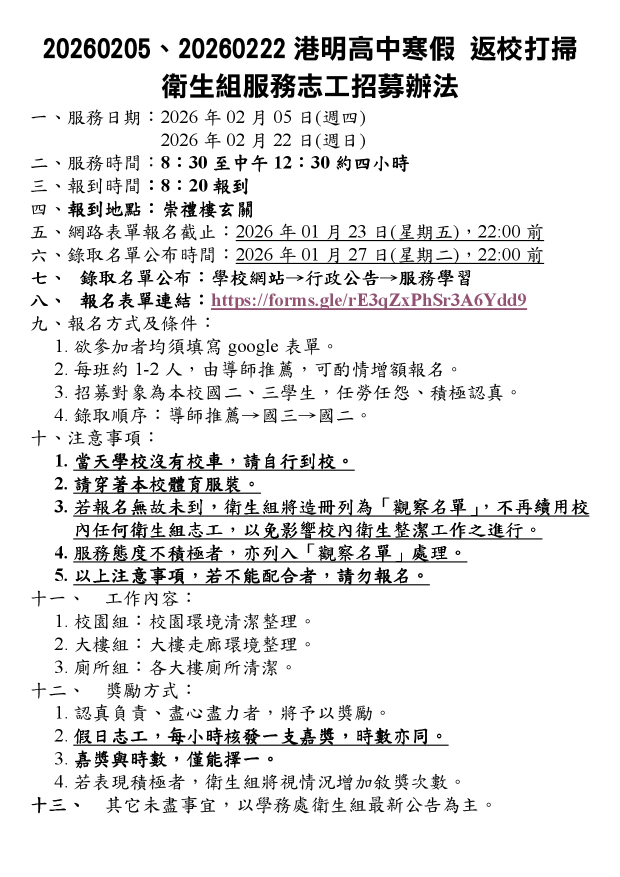 20260205、20260222 港明高中寒假返校打掃 衛生組服務志工招募